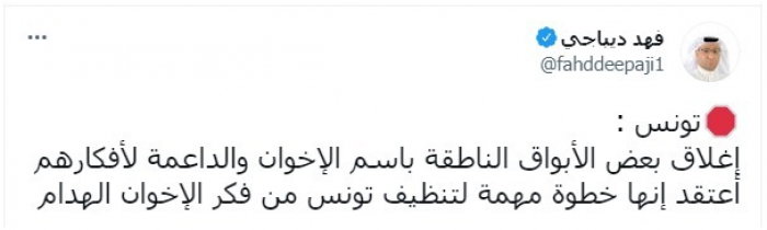 واعتبر في تغريدة عبر "تويتر"، اليوم: "إغلاق بعض الأبواق الناطقة باسم الإخوان والداعمة لأفكارهم خطوة مهمة لتنظيف تونس من فكر الإخوان الهدام".