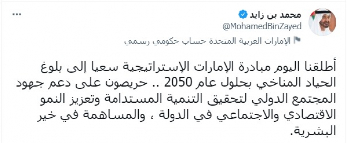 أعلن الشيخ محمد بن زايد، ولي عهد أبو ظبي، نائب القائد الأعلى للقوات المسلحة، إطلاق الإمارات المبادرة الاستراتيجية لتحقيق الحياد المناخي بحلول عام 2050.