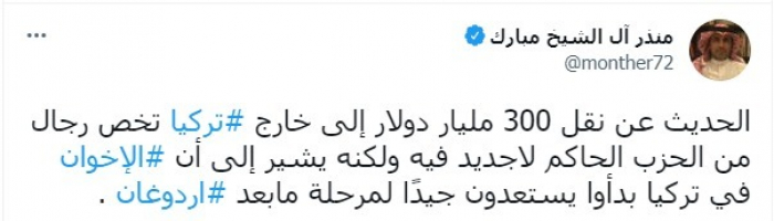 اعتبر المدون السعودي منذر آل الشيخ مبارك، أن تهريب 300 مليار دولار من تركيا خلال السنوات القليلة الماضية، يشير إلى استعداد الإخوان لمرحلة ما بعد أردوغان.