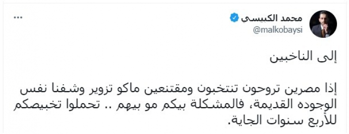وقال في تغريدة عبر "تويتر"، اليوم: "إلى الناخبين.. إذا مصرين تروحون تنتخبون ومقتنعين ماكو تزوير وشفنا نفس الوجوه القديمة، فالمشكلة بيكم مو بيهم.. تحملوا تخبيصكم للأربع سنوات الجاية".