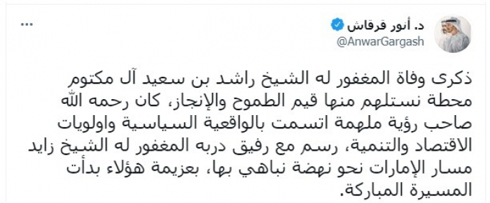 تحدث المستشار الدبلوماسي لرئيس دولة الإمارات الدكتور أنور قرقاش، عن ذكرى وفاة الشيخ راشد بن سعيد آل مكتوم.