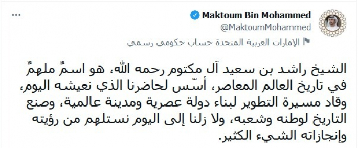 وكتب في تغريدة عبر "تويتر"، اليوم، في ذكرى وفاة الشيخ راشد، قائلا: "هو اسمٌ ملهمٌ في تاريخ العالم المعاصر، أسّس لحاضرنا الذي نعيشه اليوم".