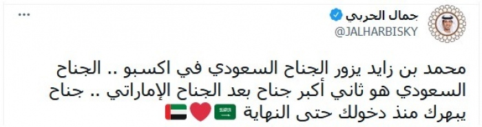 أشاد الإعلامي جمال الحربي، بجناح المملكة العربية السعودية في معرض إكسبو 2020 دبي، بعد زيارة الشيخ محمد بن زايد، ولي عهد أبوظبي، اليوم.