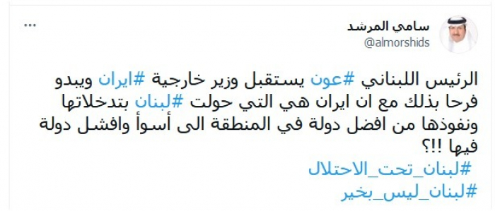 استنكر المحلل السياسي السعودي سامي المرشد، استقبال الرئيس اللبناني ميشال عون، لوزير الخارجية الإيراني المدعو حسين عبداللهيان.