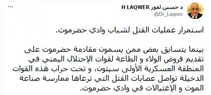 لقور مستنكرا: الاحتلال اليمني يواصل اغتيال شباب حضرموت