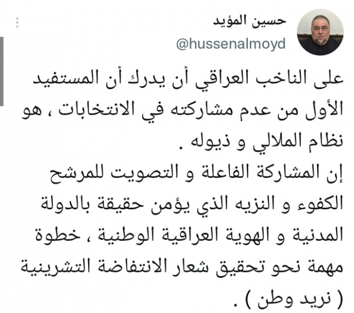 وأكد في تغريدة على حسابه بموقع التدوين المصغر تويتر، اليوم أنه: "على الناخب العراقي أن يدرك أن المستفيد الأول من عدم مشاركته في الانتخابات، هو نظام الملالي وذيوله".