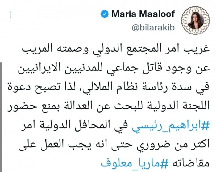 استنكرت الإعلامية ماريا معلوف، تجاهل المجتمع الدولي وصول قاتل مستبد إلى قمة السلطة في النظام الإيراني، مطالبة بمحاكمته دوليا.