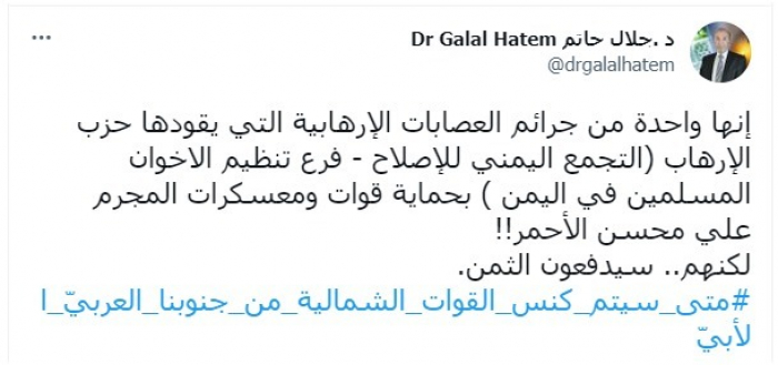 حاتم: إخوان اليمن سيدفعون ثمن إرهابهم بحضرموت