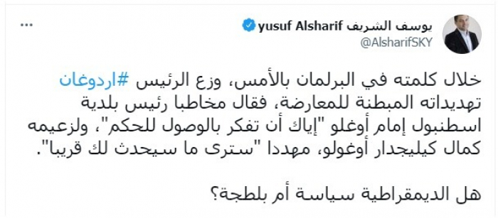واستند إلى كلمة أردوغان في البرلمان، قائلا: "وزع أردوغان تهديداته المبطنة للمعارضة، فقال مخاطبا رئيس بلدية اسطنبول إمام أوغلو إياك أن تفكر بالوصول للحكم، ولزعيمه كمال كيليجدار أوغولو، سترى ما سيحدث لك قريبا".