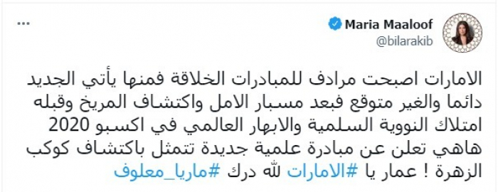 أشادت الإعلامية اللبنانية ماريا معلوف، بالجهود الكبيرة التي تبذلها دولة الإمارات في مختلف المجالات، وتسبق الجميع بمبادراتها الخلاقة.