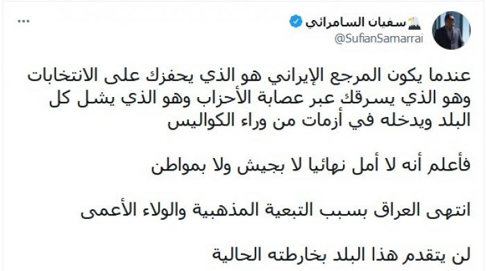 استنكر الإعلامي العراقي سفيان السامرائي، التبعية المذهبية والولاء الأعمى للنظام الإيراني الذي أنهى العراق وأغرقه في الأزمات.