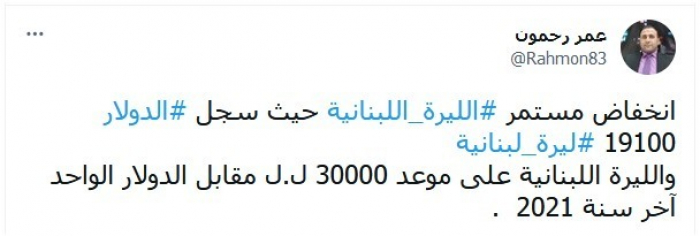 وأشار في تغريدة عبر "تويتر"، اليوم، إلى "انخفاض الليرة اللبنانية المستمر حيث سجل الدولار 19100 ليرة لبنانية".