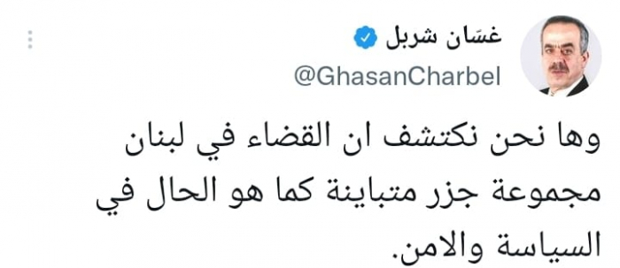 وقال في تغريدة على حسابه بموقع التدوين المصغر تويتر، اليوم إن: "ها نحن نكتشف أن القضاء في لبنان مجموعة جزر متباينة كما هو الحال في السياسة والأمن".