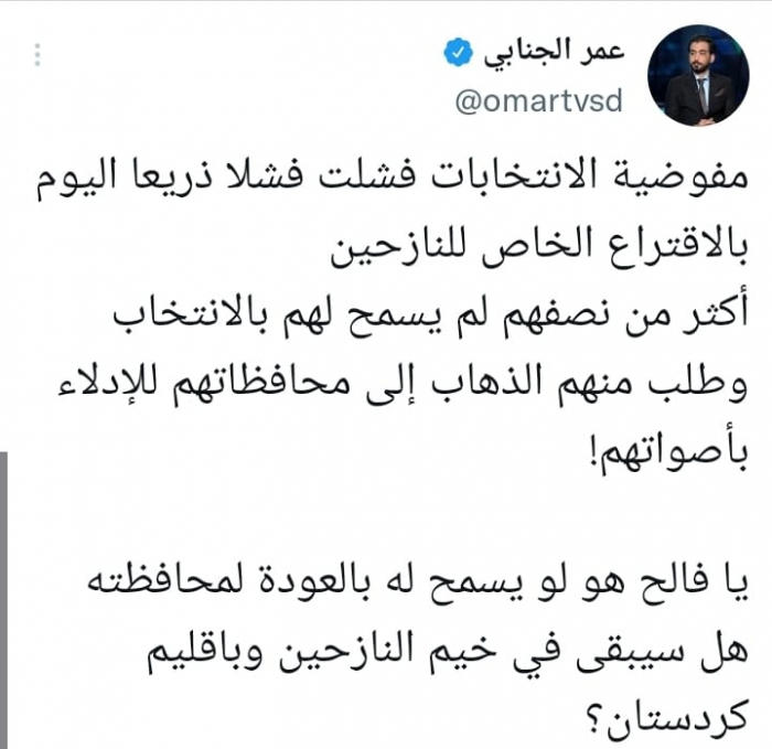 وأكد أن: "أكثر من نصفهم لم يسمح لهم بالانتخاب وطلب منهم الذهاب إلى محافظاتهم للإدلاء بأصواتهم!"، قائلا: "يا فالح هو لو يسمح له بالعودة لمحافظته، هل سيبقى في خيم النازحين وبإقليم كردستان".
