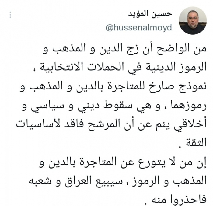 وأكد في تغريدة على حسابه بموقع التدوين المصغر تويتر، اليوم أنه: "من الواضح أن زج الدين والمذهب والرموز الدينية في الحملات الانتخابية، نموذج صارخ للمتاجرة بالدين والمذهب ورموزهما".