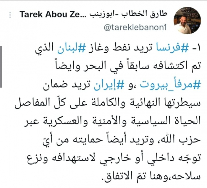 واعتبر في تغريدة على حسابه بموقع التدوين المصغر تويتر، اليوم أن: "فرنسا تريد نفط وغاز لبنان الذي تم اكتشافه سابقاً في البحر وأيضا مرفأ بيروت".