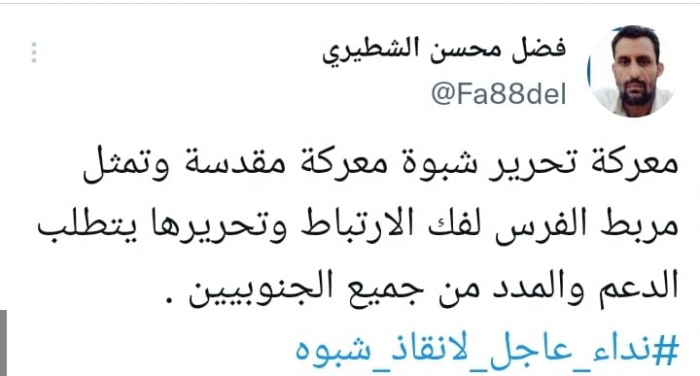 وقال في تغريدة على حسابه بموقع التدوين المصغر تويتر، اليوم إن: "معركة تحرير شبوة معركة مقدسة وتمثل مربط الفرس لفك الارتباط، وتحريرها يتطلب الدعم والمدد من جميع الجنوبيين"، مختتما بهاشتاج: "نداء عاجل لإنقاذ شبوة".