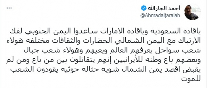 طالب الكاتب الصحفي الكويتي أحمد الجارالله، رئيس تحرير صحيفة السياسة، دولتي الإمارات والسعودية بالانحياز إلى قرار شعب الجنوب بفك الارتباط، مؤكدا أن مليشيا الحوثي تبيع الأرض للنظام الإيراني، وتدفع الأبرياء إلى المحارق.
