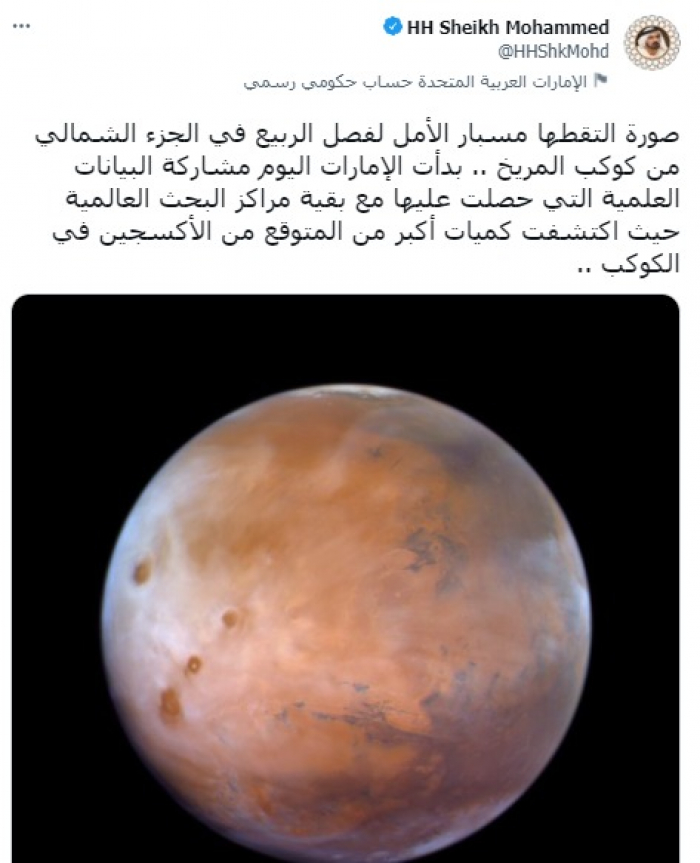 ونشر في تغريدة على حسابه بموقع تويتر، اليوم السبت، "صورة التقطها مسبار الأمل لفصل الربيع في الجزء الشمالي من كوكب المريخ".