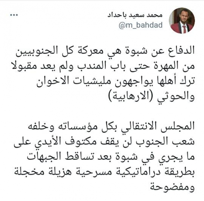 دعا الناشط السياسي محمد سعيد باحداد شعب الجنوب العربي إلى الدفاع عن شبوة من مليشيا الحوثي المدعومة من إيران ومليشيات الشرعية الإخوانية، مؤكدا أنها معركة جنوبية يتقدمها المجلس الانتقالي الجنوبي.