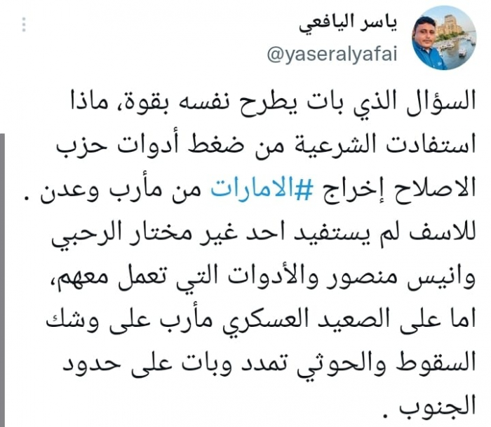 وأكد في تغريدة على حسابه بموقع التدوين المصغر تويتر، اليوم أن: "السؤال الذي بات يطرح نفسه بقوة، ماذا استفادت الشرعية من ضغط أدوات حزب الإصلاح وإخراج الإمارات من مأرب وعدن؟".