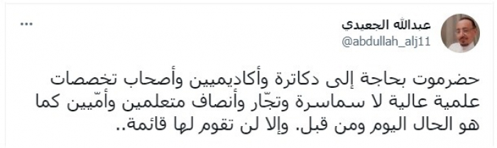 جاء ذلك في تغريدة عبر "تويتر"، اليوم، قائلا: "حضرموت بحاجة إلى دكاترة وأكاديميين وأصحاب تخصصات علمية عالية لا سماسرة وتجّار وأنصاف متعلمين وأمّيين كما هو الحال اليوم ومن قبل وإلا لن تقوم لها قائمة".