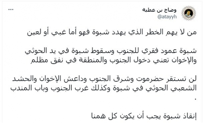وأشار إلى أن: "شبوة عمود فقري للجنوب وسقوط شبوة في يد الحوثي والإخوان تعني دخول الجنوب والمنطقة في نفق مظلم".