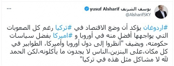 الشريف يسخر من تصريحات أردوغان بشأن الاقتصاد