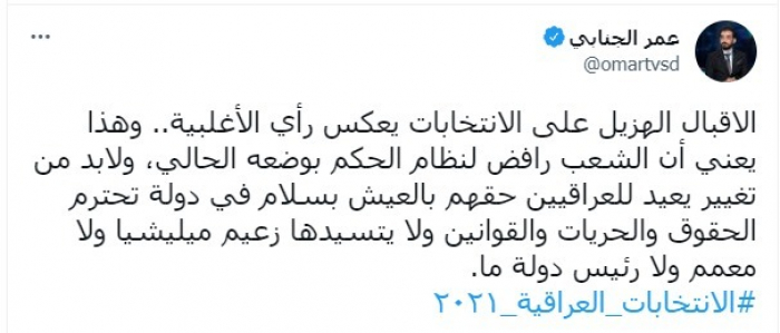اعتبر الكاتب الصحفي العراقي عمر الجنابي، عزوف العراقيين عن المشاركة في الانتخابات البرلمانية، رسالة للنظام العراقي ومليشيات إيران برفض الوضع الحالي.