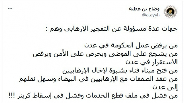بن عطية يحمل 5 أطراف مسؤولية جريمة حجيف الإرهابية