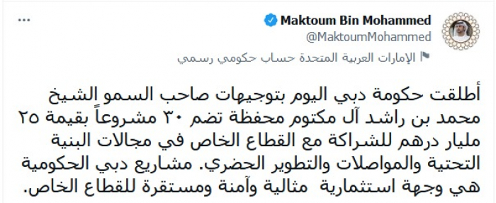 وكتب في تغريدة عبر "تويتر"، أن حكومة دبي: "أطلقت المحفظة بتوجيهات صاحب السمو الشيخ محمد بن راشد آل مكتوم، في مجالات البنية التحتية والمواصلات والتطوير الحضري".