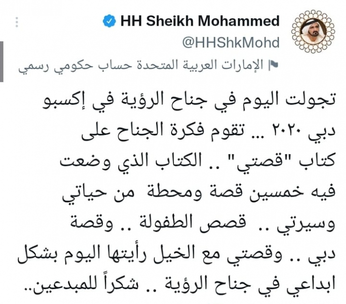 وقال في تغريدة على حسابه بموقع التدوين المصغر تويتر، اليوم إني: "تجولت اليوم في جناح الرؤية في إكسبو دبي 2020، تقوم فكرة الجناح على كتاب قصتي".