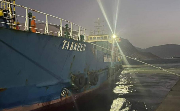 رست سفينة مشتقات نفطية قادمة من دولة الإمارات العربية المتحدة، اليوم الأحد، في ميناء حولف بأرخبيل سقطرى.