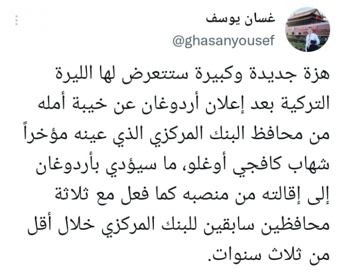 وأشار في تغريدة على حسابه بموقع التدوين المصغر تويتر، اليوم إلى: "هزة جديدة وكبيرة ستتعرض لها الليرة التركية بعد إعلان أردوغان عن خيبة أمله من محافظ البنك المركزي الذي عينه مؤخرا شهاب كافجي أوغلو".