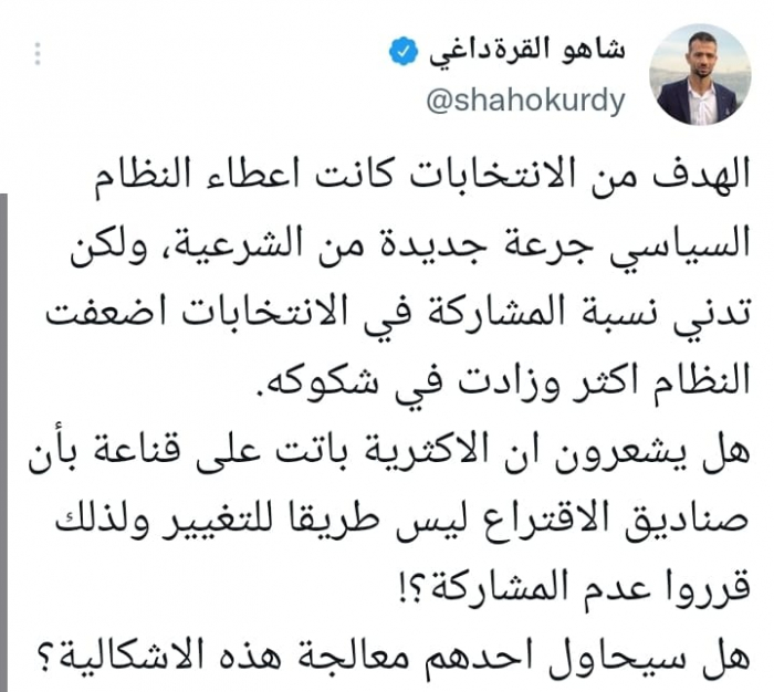اعتبر الكاتب الصحفي شاهو قرة داغي، أن تراجع الإقبال على التصويت في الانتخابات العراقية، يؤشر إلى ضعف النظام العراقي وتزايد الشكوك حول شرعيته.