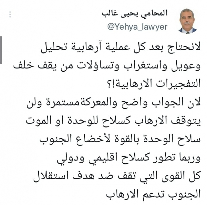 واستطرد: "لأن الجواب واضح والمعركة مستمرة ولن يتوقف الإرهاب كسلاح للوحدة أو الموت"، مضيفا أنه: "سلاح الوحدة بالقوة لإخضاع الجنوب، وربما تطور كسلاح إقليمي ودولي".