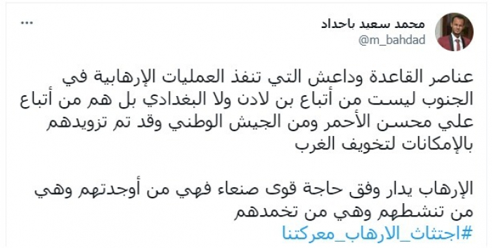 وأوضح أن: "عناصر القاعدة وداعش التي تنفذ العمليات الإرهابية في الجنوب ليست من أتباع بن لادن ولا البغدادي بل هم من أتباع علي محسن الأحمر ومن ما يسمى بالجيش الوطني وتم تزويدهم بالإمكانات لتخويف الغرب".