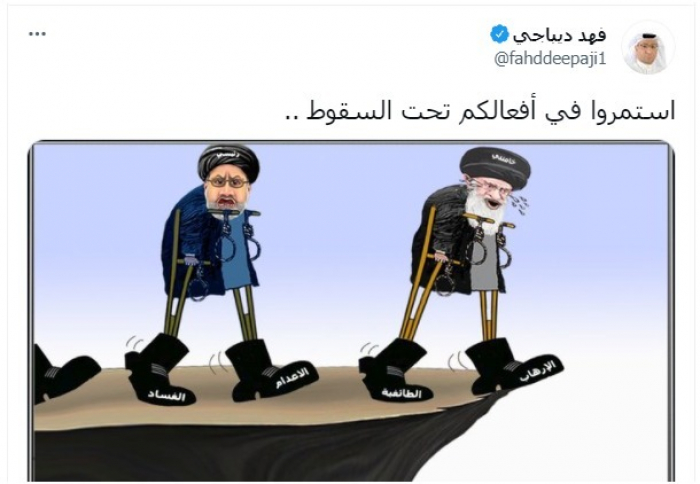 ولفت في تغريدة عبر "تويتر"، اليوم، إلى النظام الإيراني، قائلا:استمروا في أفعالكم تحت السقوط"، مستعينا بكاريكاتير يوضح استناد خامنئي ورئيسي إلى عصا الإرهاب والطائفية والإعدام والفساد، التي تقوده نحو السقوط.