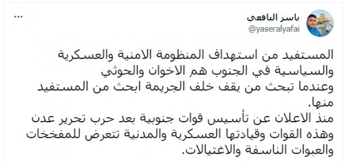 وأكد أن: "المستفيد من استهداف المنظومة الأمنية والعسكرية والسياسية في الجنوب هم الإخوان والحوثي وعندما تبحث من يقف خلف الجريمة ابحث من المستفيد منها".