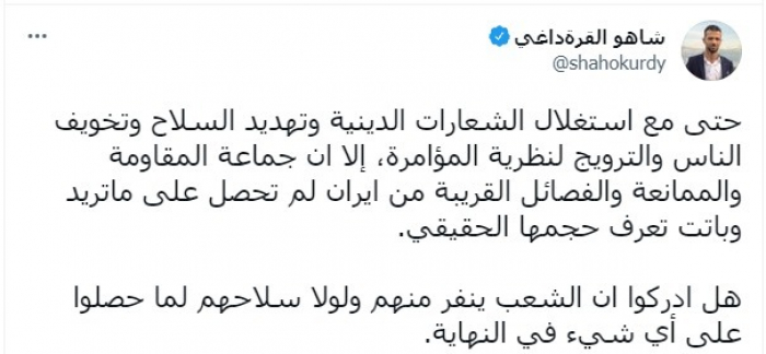 اعتبر الكاتب الصحفي العراقي شاهو القرة داغي، أن عدم مشاركة الشعب العراقي للانتخابات البرلمانية، كشف نفوره من مليشيات إيران.