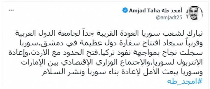 توقع أمجد طه، الرئيس الإقليمي للمركز البريطاني لدراسات الشرق الأوسط، عودة سوريا لجامعة الدول العربية قريبا، بعد وقوفها في وجه النفوذ التركي.