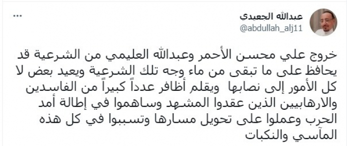 واعتبر في تغريدة عبر "تويتر"، اليوم، أن: "خروج المدعو علي محسن الأحمر والمدعو عبدالله العليمي من الشرعية قد يحافظ على ما تبقى من ماء وجه تلك الشرعية ويعيد بعض لا كل الأمور إلى نصابها".
