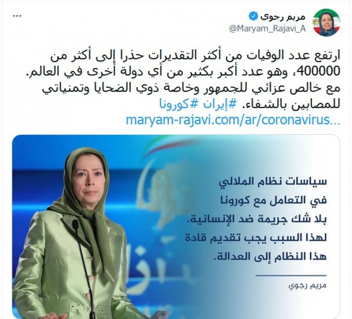 طالبت زعيمة المعارضة الإيرانية مريم رجوي، بمحاكمة نظام الملالي، نتيجة سياساته في التعامل مع أزمة كورونا، تزامنا مع تجاوز إجمالي الوفيات 400 ألف حالة وفاة.