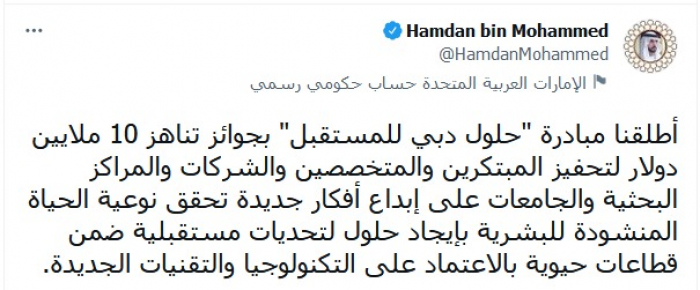 وأوضح في تغريدة عبر "تويتر"، اليوم، أن المبادرة تهدف: "لتحفيز المبتكرين والمتخصصين والشركات والمراكز البحثية والجامعات على إبداع أفكار جديدة تحقق نوعية الحياة المنشودة للبشرية بإيجاد حلول لتحديات مستقبلية ضمن قطاعات حيوية بالاعتماد على التكنولوجيا والتقنيات الجديدة".