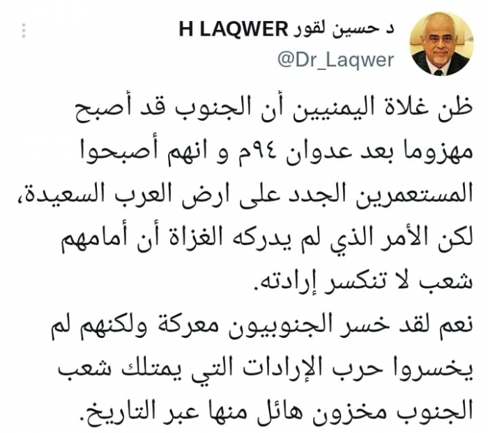 وأشار في تغريدة على حسابه بموقع التدوين المصغر تويتر، اليوم إلى أنه: "ظن غلاة اليمنيين أن الجنوب قد أصبح مهزوما بعد عدوان 94م وأنهم أصبحوا المستعمرين الجدد على أرض العرب السعيدة".
