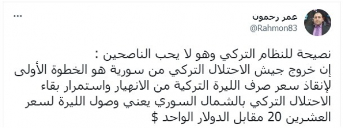 وتابع: "استمرار بقاء الاحتلال التركي بالشمال السوري يعني وصول الليرة لسعر 20 مقابل الدولار الواحد".