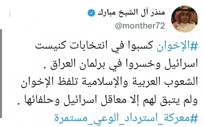 وأشار في تغريدة على حسابه بموقع التدوين المصغر تويتر، اليوم إلى أن: "الإخوان كسبوا في انتخابات كنيست إسرائيل وخسروا في برلمان العراق".