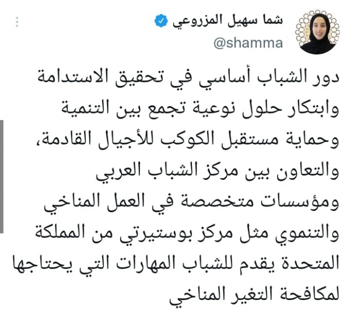 وشددت في تغريدة على حسابها بموقع التدوين المصغر تويتر، اليوم على أن: "دور الشباب أساسي في تحقيق الاستدامة وابتكار حلول نوعية تجمع بين التنمية وحماية مستقبل الكوكب للأجيال القادمة".