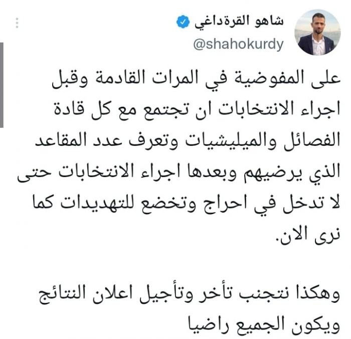 وقال في تغريدة على حسابه بموقع التدوين المصغر تويتر، اليوم إنه: "على المفوضية في المرات القادمة وقبل إجراء الانتخابات أن تجتمع مع كل قادة الفصائل والميليشيات وتعرف عدد المقاعد الذي يرضيهم وبعدها إجراء الانتخابات".