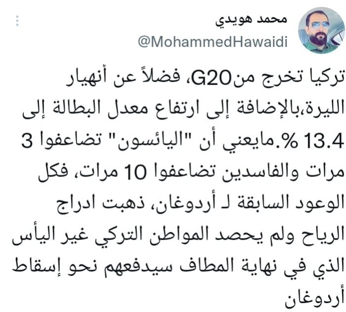 وأشار في تغريدة على حسابه بموقع التدوين المصغر تويتر، اليوم إلى أن: "تركيا تخرج منG20، فضلاً عن انهيار الليرة، بالإضافة إلى ارتفاع معدل البطالة إلى 13.4 %".